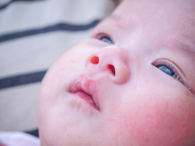 - 볼, 이마, 두피, 팔·다리 바깥쪽에 붉은 발진